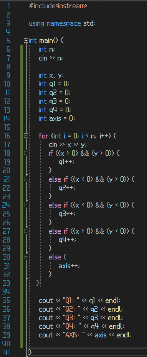 각 사분면의 경우를 if-else if문으로 처리하고, 어떠한 사분면에도 속하지 않을 때는 else로 처리했다