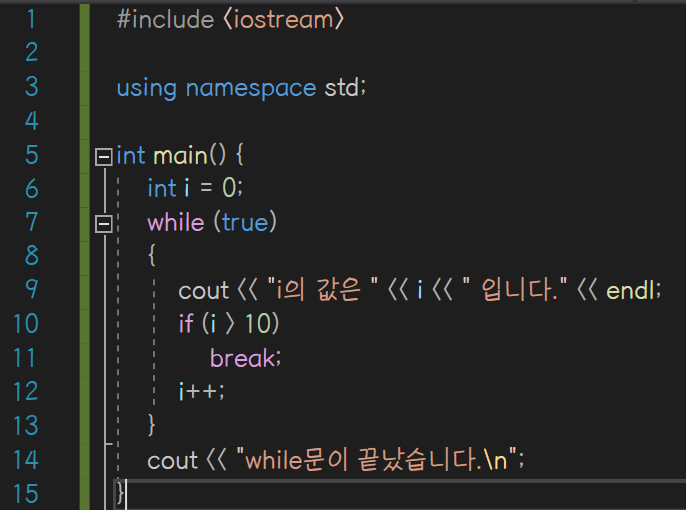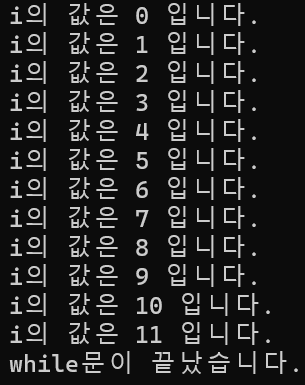 i의 값이 11이 되었을 때 i의 값이 10보다 크게 되므로 break 구문이 작동하여 while문을 탈출하게 된다