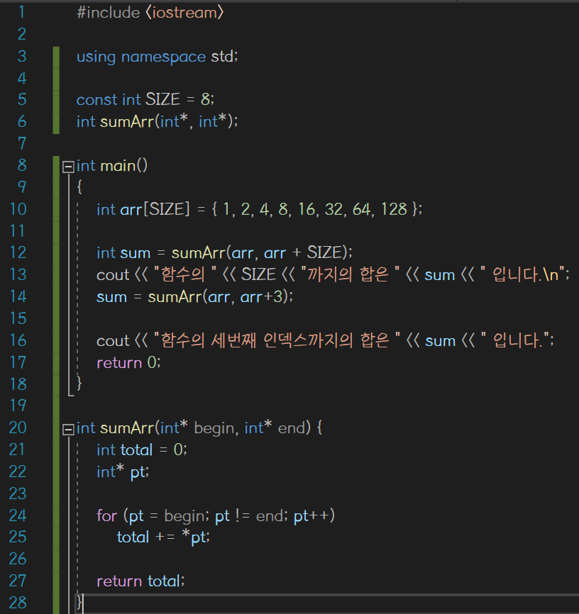 그럼에도 함수가 제대로 동작할 수 있었던 이유는 C++에서 배열 이름을 그 배열의 첫번째 원소의 주소로 인식하기 때문이다