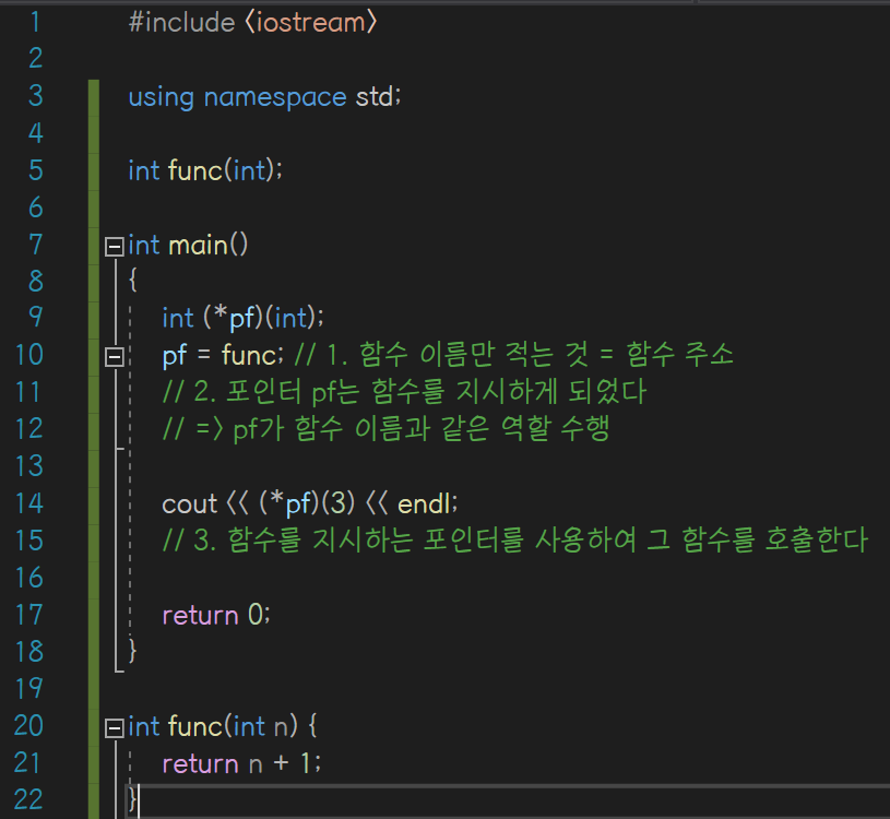 함수를 지시하는 포인터는 함수 이름과 같은 역할을 수행하므로 포인터를 사용하여 그 함수를 호출할 수 있다