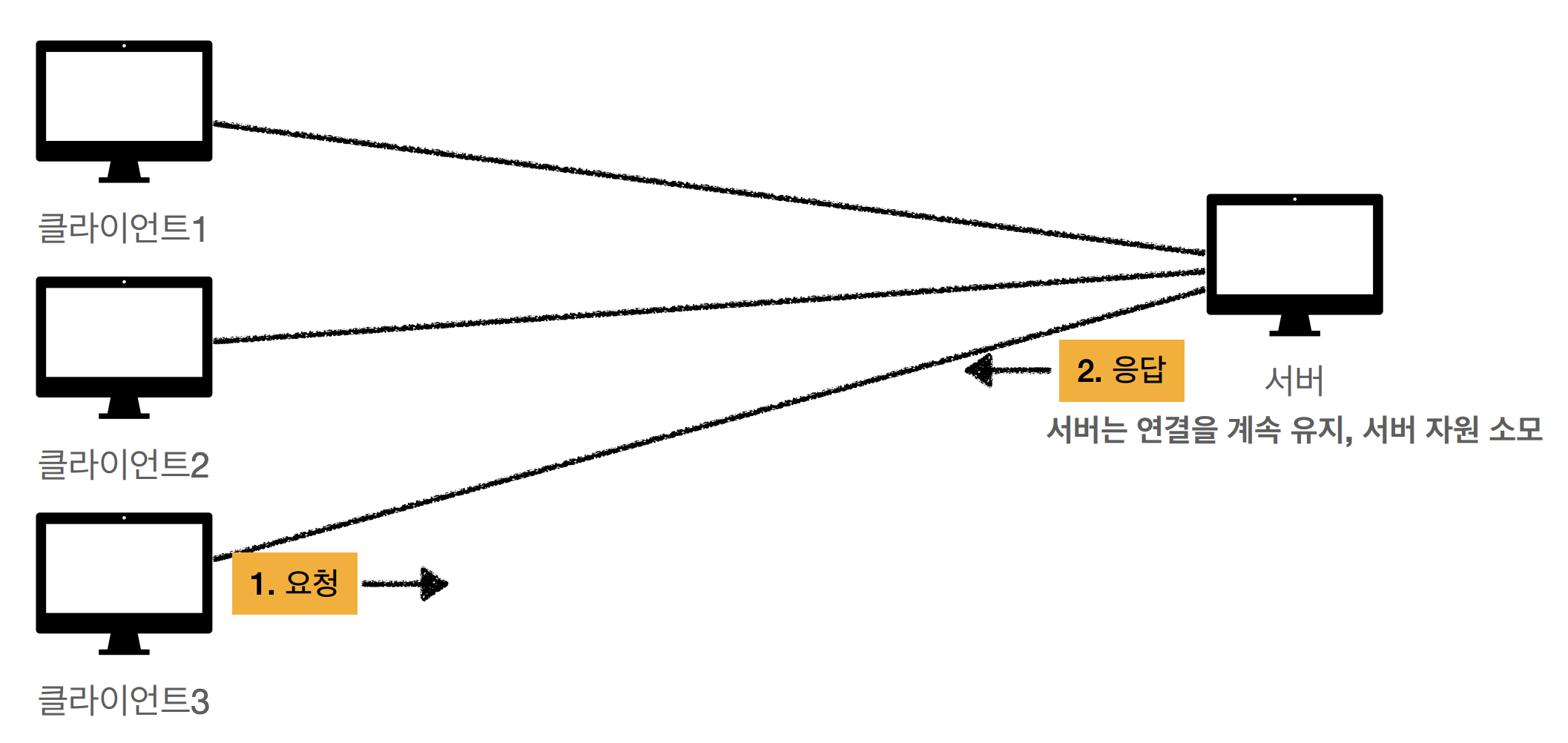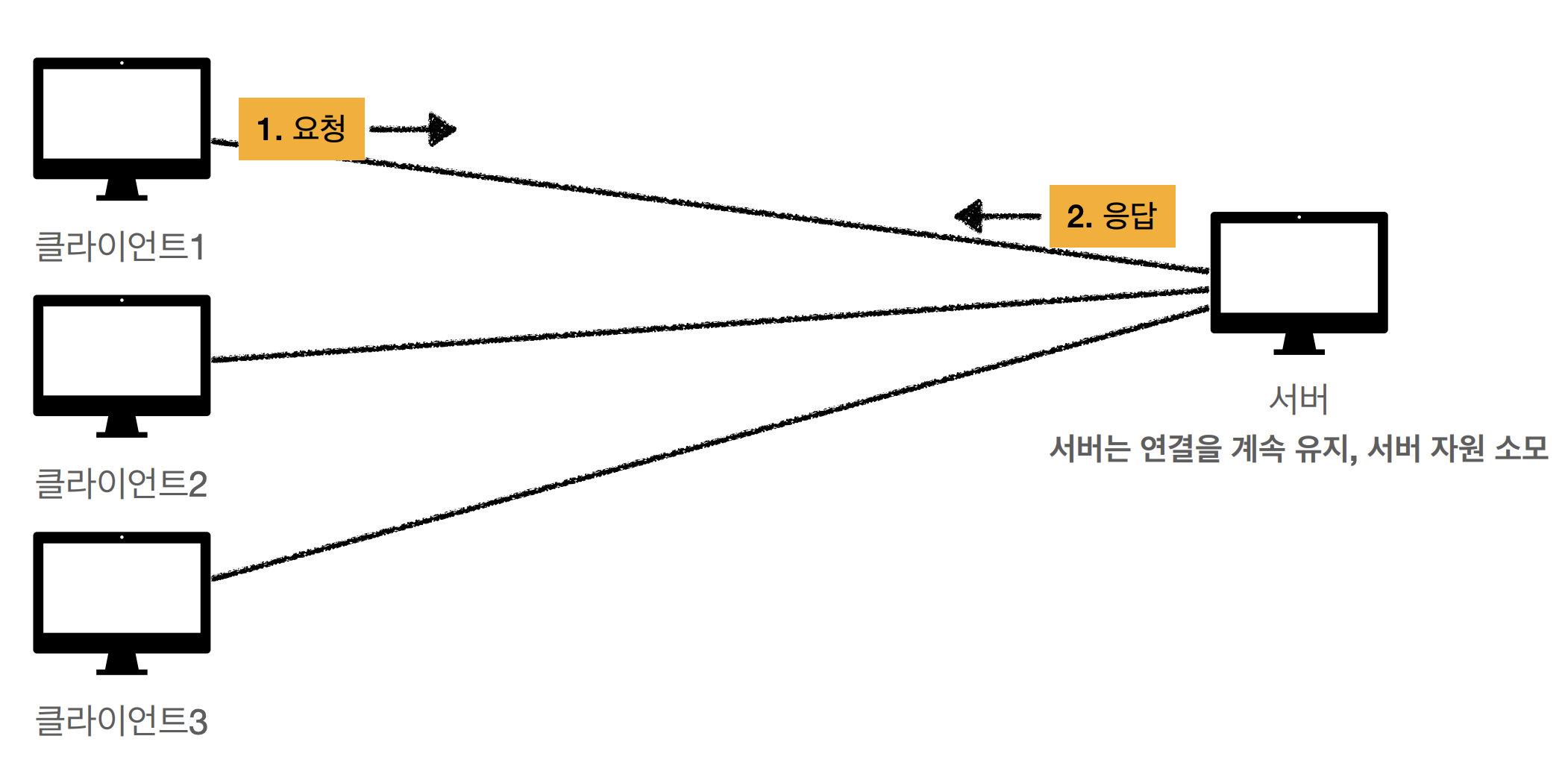 위와 같이 서버는 요청을 보내는 클라이언트들과 지속적으로 연결되어 있기 때문에 서버 자원을 지속적으로 소모된다.