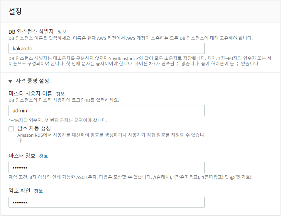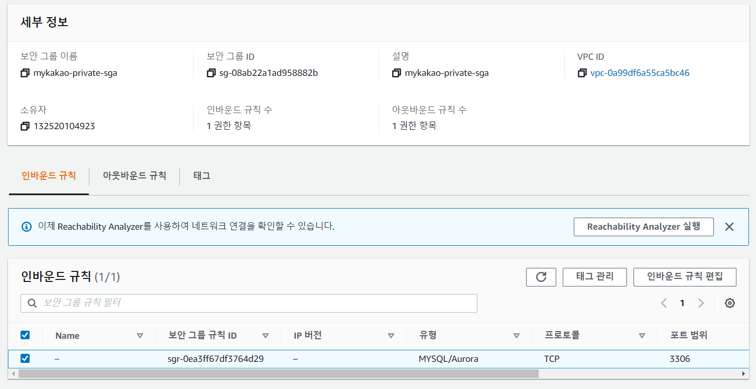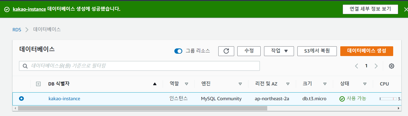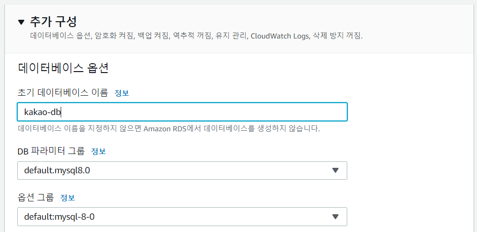 [ec2-user@ip-172-31-40-76 ~]$ mysql -uadmin -p -h kakao-instance.cl36vm2fbrhx.ap-northeast-2.rds.amazonaws.com