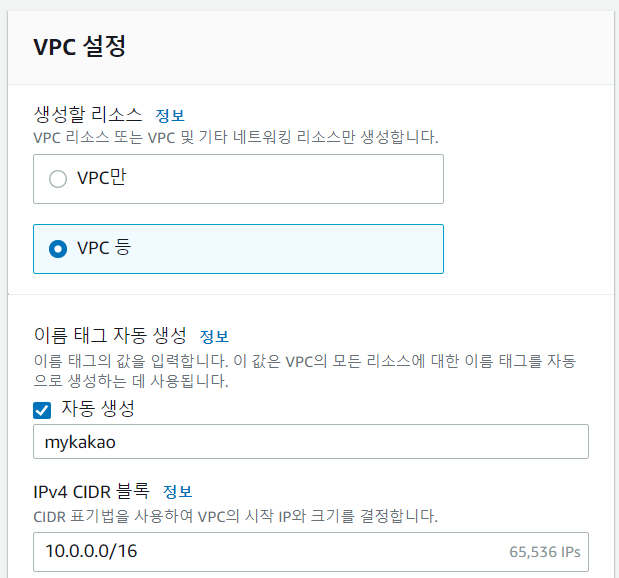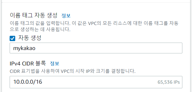 이름과 cidr 설정