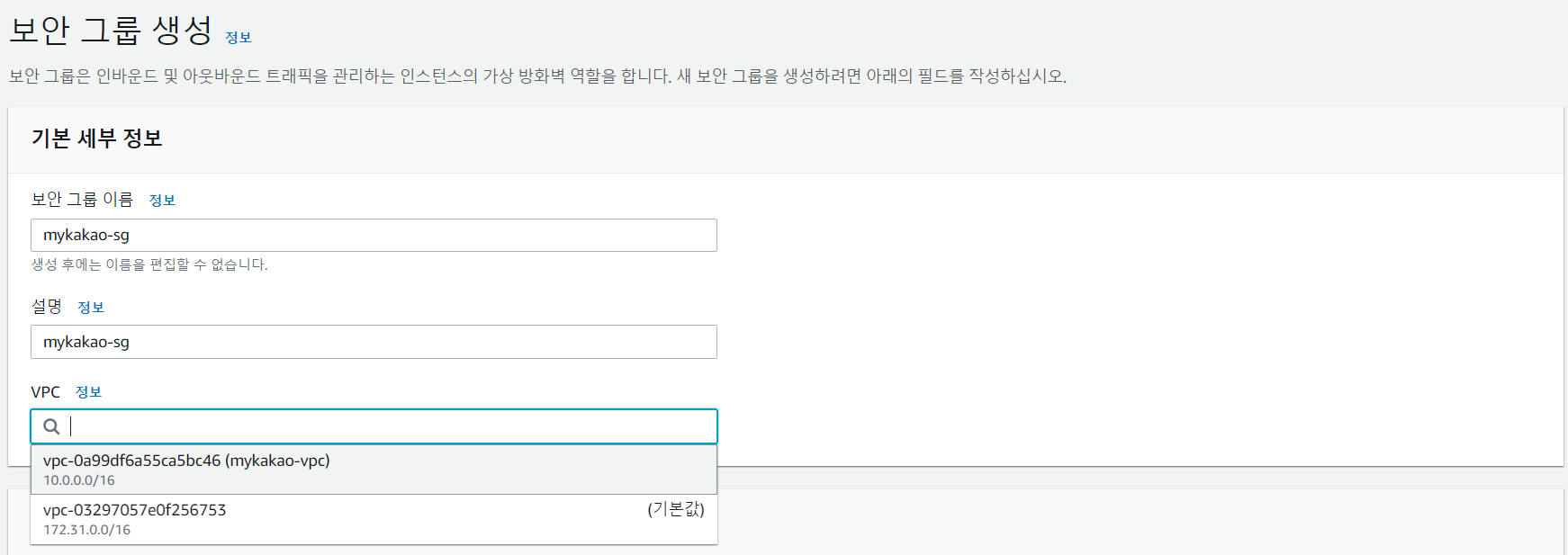 이름 설정하고 VPC 선택 - default 삭제하고 다시 선택해야 한다