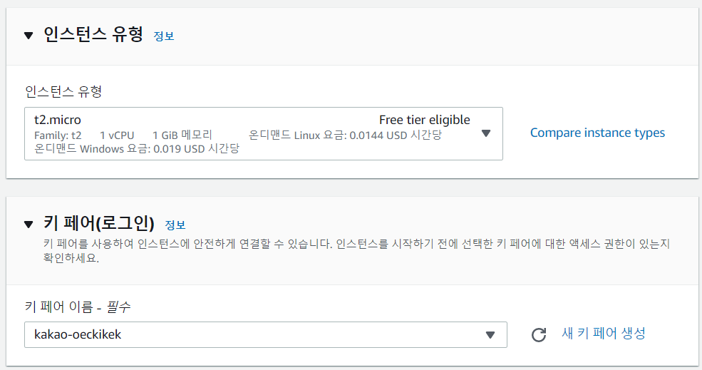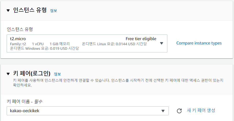 인스턴스 유형, 키 페어 선택