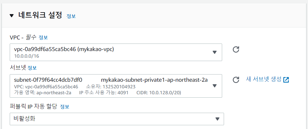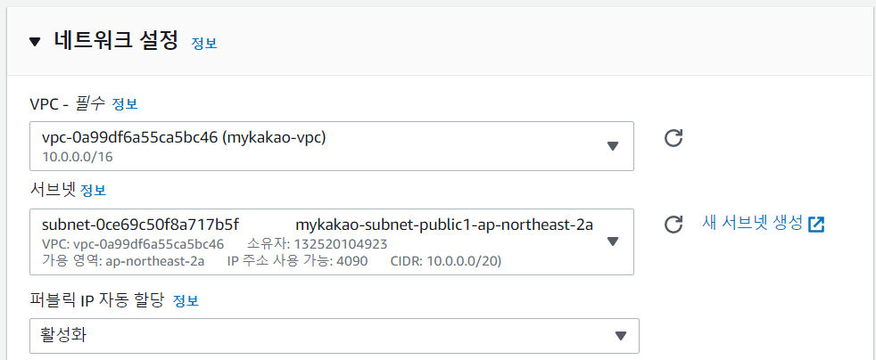 네트워크를 생성한 VPC로 설정