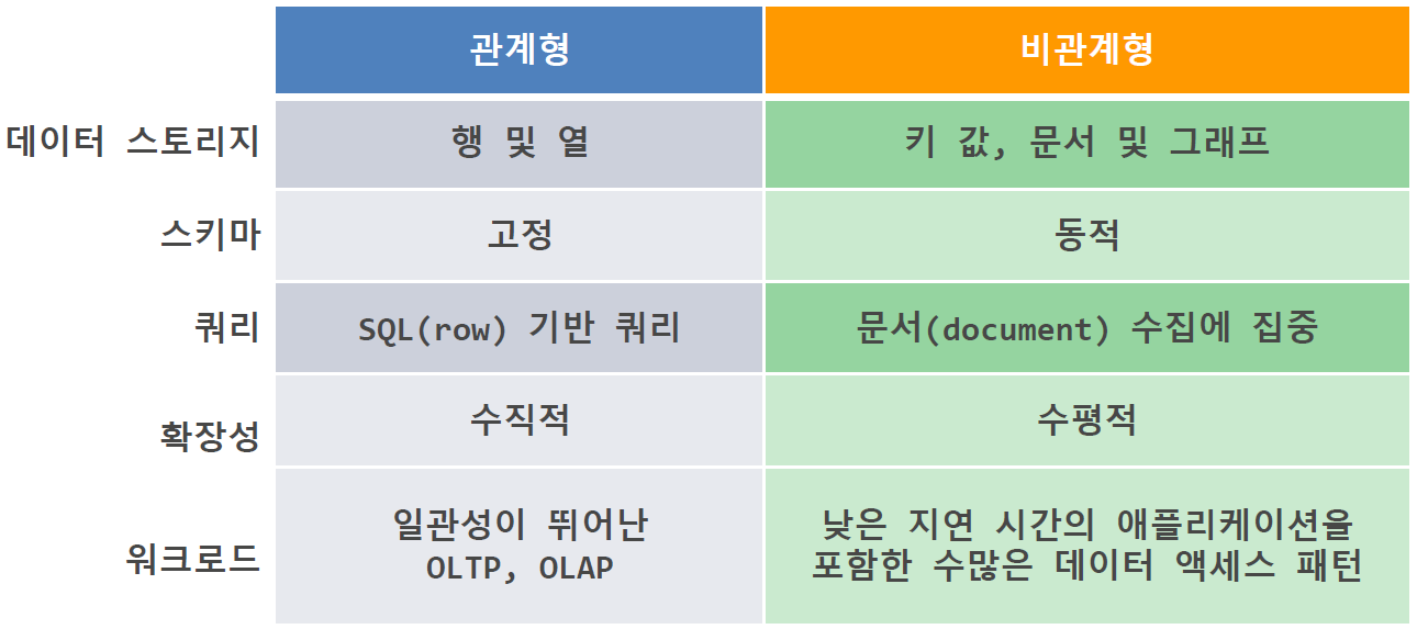 : 데이터를 넣는 방식, 규칙이 정해져 있지 않다. key, value 구조이다.