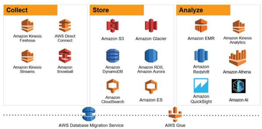 Amazon은 데이터를 캡처하고 저장하는 트랜잭션 데이터베이스, 대량 데이터의 추세를 분석하고 발견할 수 있는 다양한 데이터웨어하우스를 제공한다.