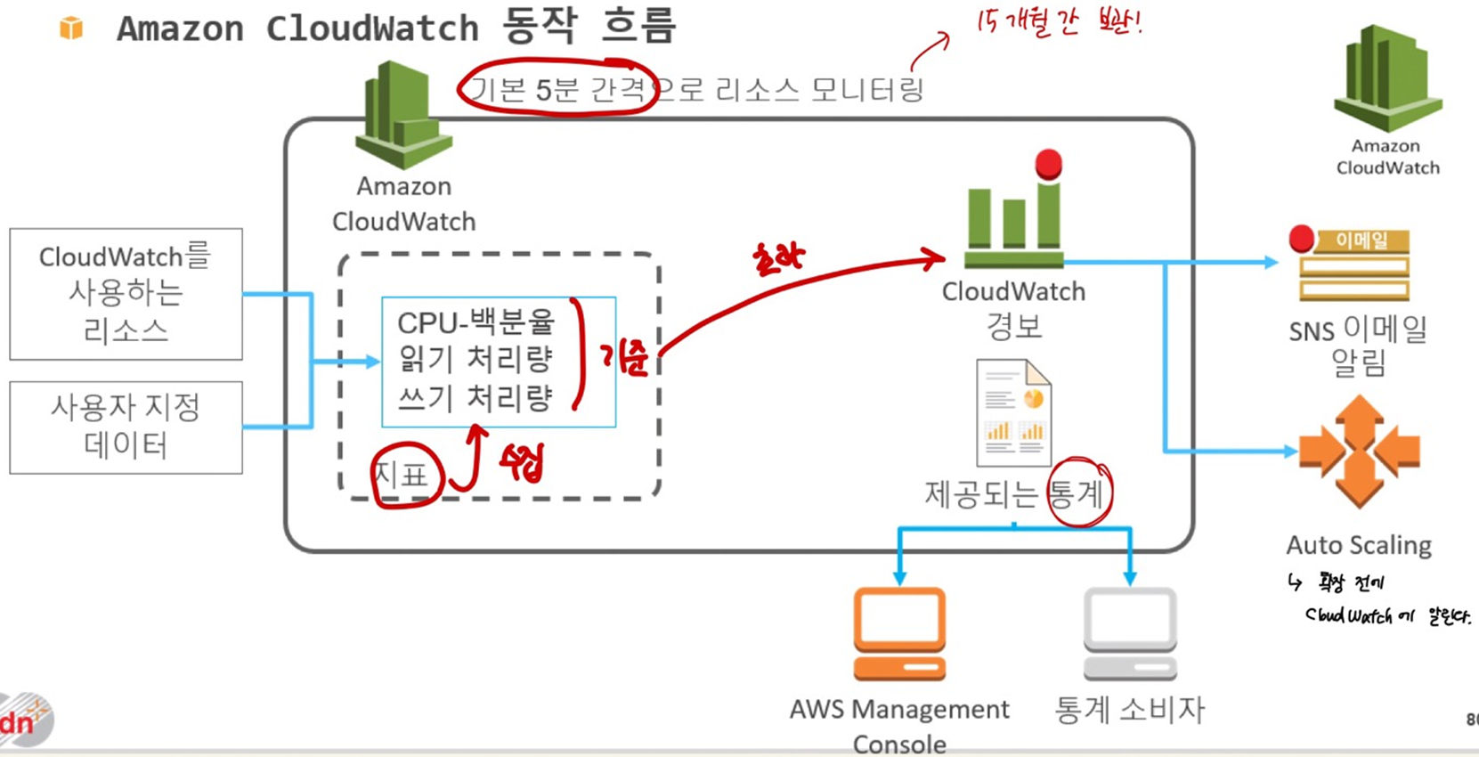 : AWS내 자원/서비스들에 대한 모니터링 및 관리 서비스. AWS의 가장 큰 모니터링 도구이다.