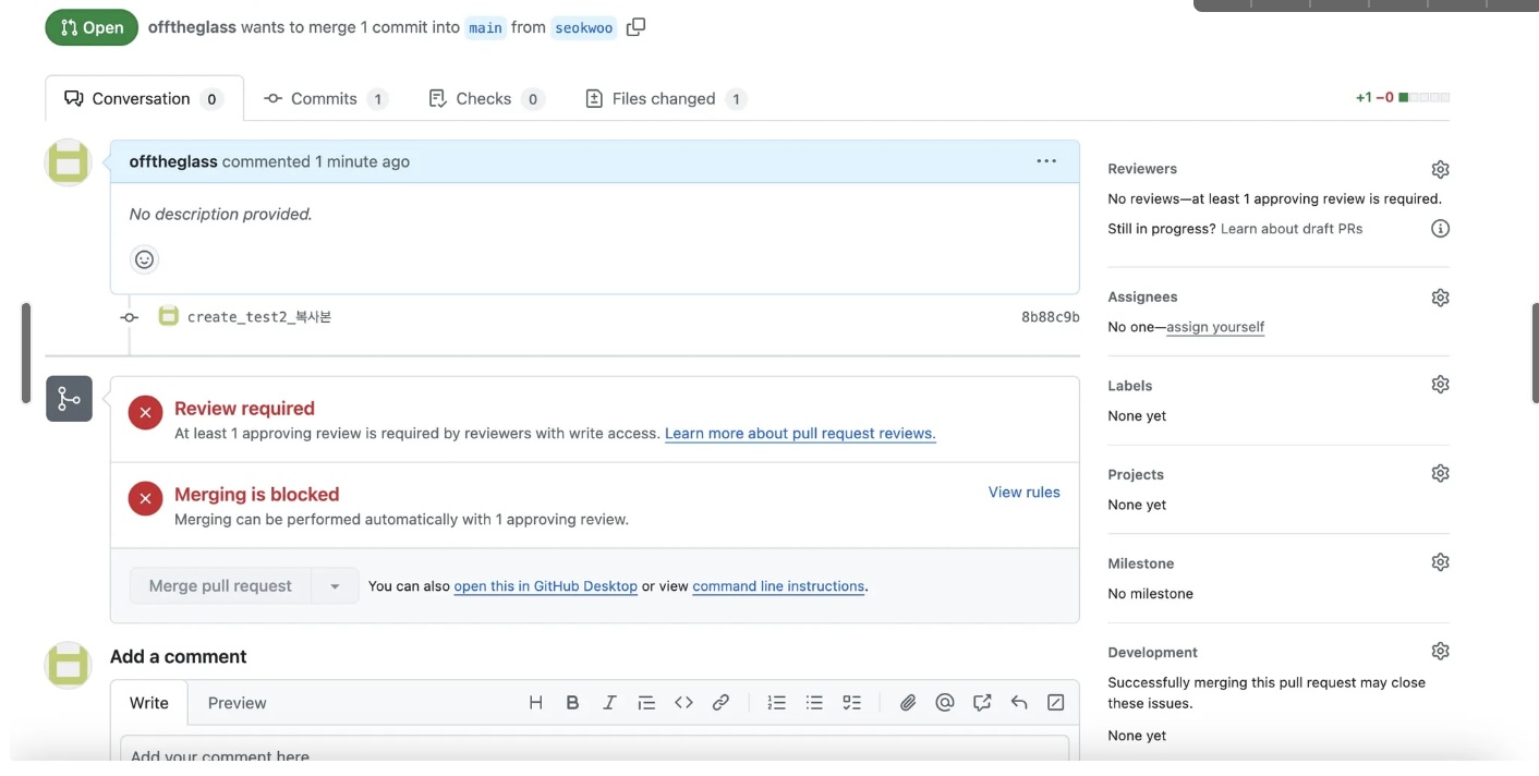 이렇게 뜲. 지금 base에서 merge막아놔서 안 되는 거임. 한명이상이 승인해줘야 머지가능(코드리뷰를 위해 이런식으로 많이함)