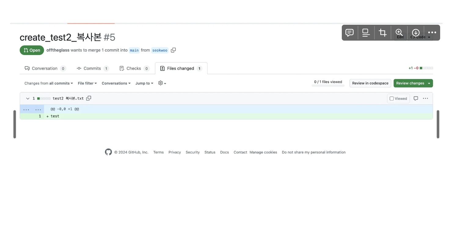 이렇게 뜲. 이제 이거보고 승인할거면 approve누르고 submit review 누르면 됨.
