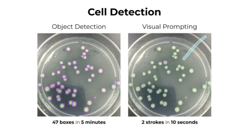 하지만 visual prompting을 통해 한 개의 세포와 이에 해당하지 않는 부분을 표시해주면 작업이 끝난다! 무려! 단 2번의 손길로 끝!