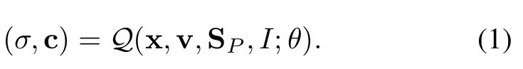 - 수학적으로, 목적은 random pose를 취하고 있는 human actor를 포착하는 작은 M개의 frame I={Im}들이 주어질 때, network는 랜덤으로 샘플링된 view point v와 target pose SP에 대해 3D point x를 color vector c=(r,g,b)와 density σ로 mapping한다.