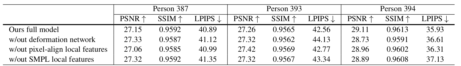 - 게다가, 우리는 pixel-aligned local feature들이나 smpl local feature들이 낮은 LPIPS 점수를 야기하며 이는 모든 요소들이 최고의 전반적 성능을 달성하는데 있어 필수적임을 보여준다.
