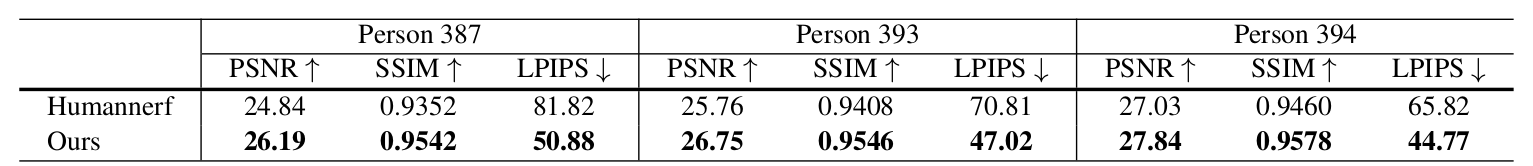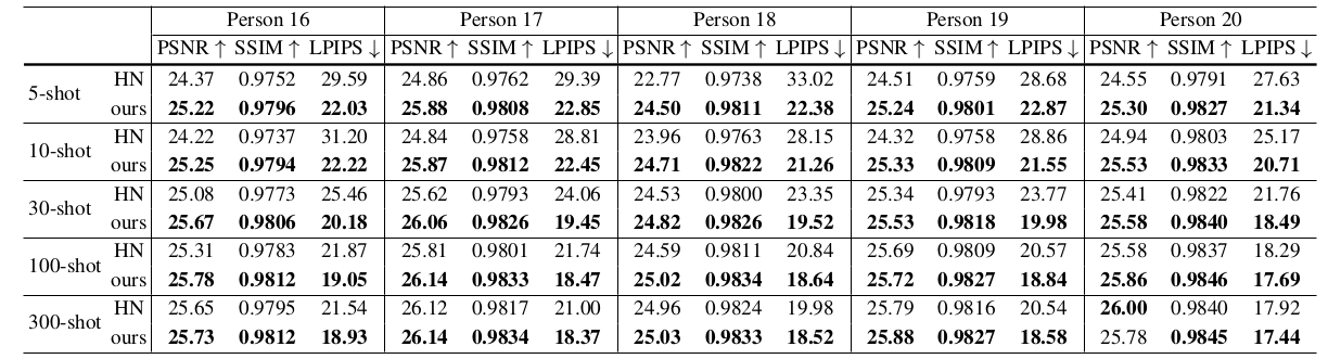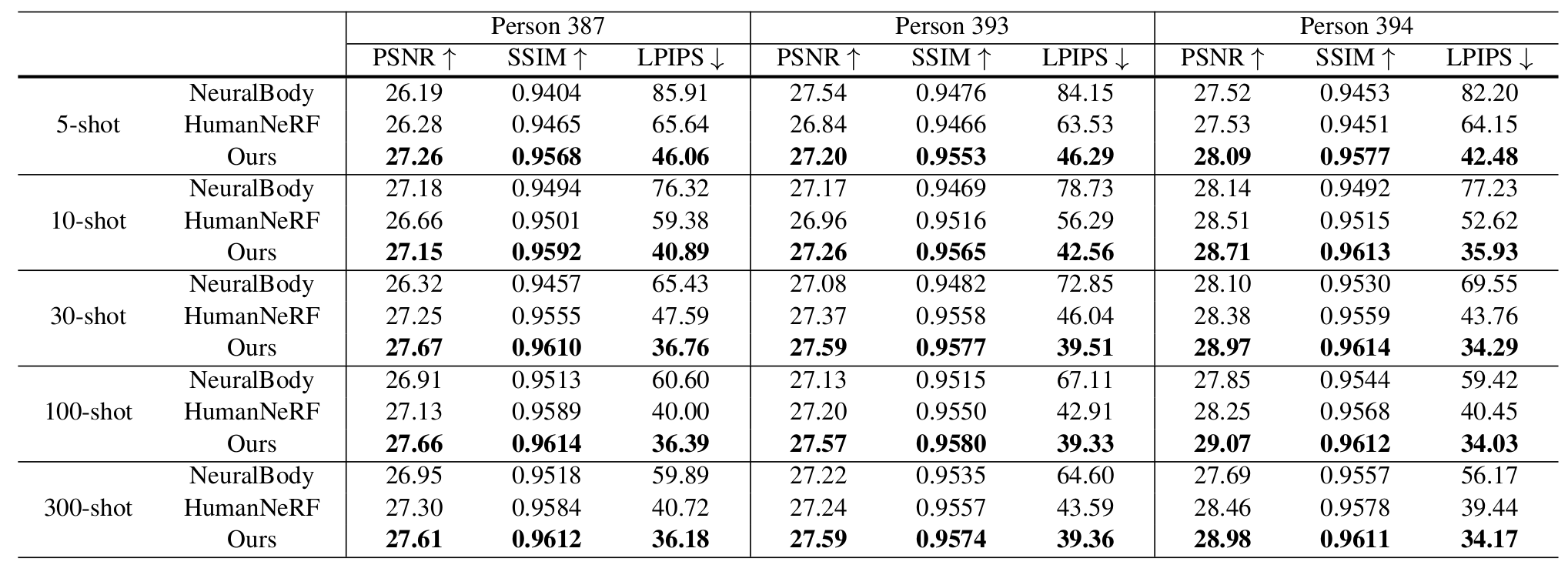Table 1: Few-shot generalization comparison for novel view synthesis of novel actors with unseen poses on the ZJU-MoCap dataset.