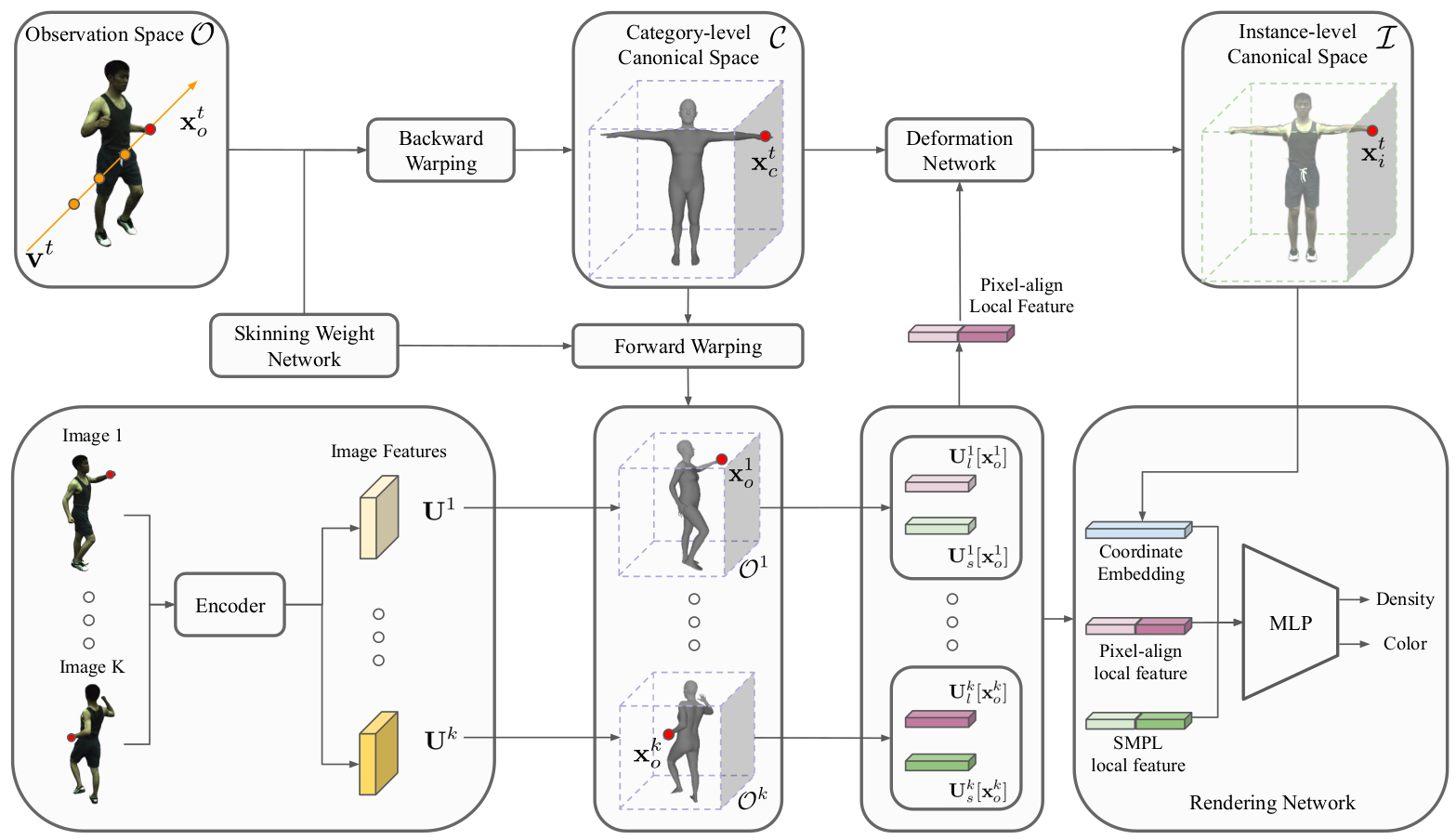 - Category-level pre-training과 finetuning에서, 우리의 아이디어는 sampled point를 category-level canonical space로 mapping하고 instance-level canonical space로 순서대로 mapping하는것이이다. Instance-level canonical space에서 human body는 canonical pose로 표현되고 encoder feature에 대해 조절되어 color와 density를 rendering한다.