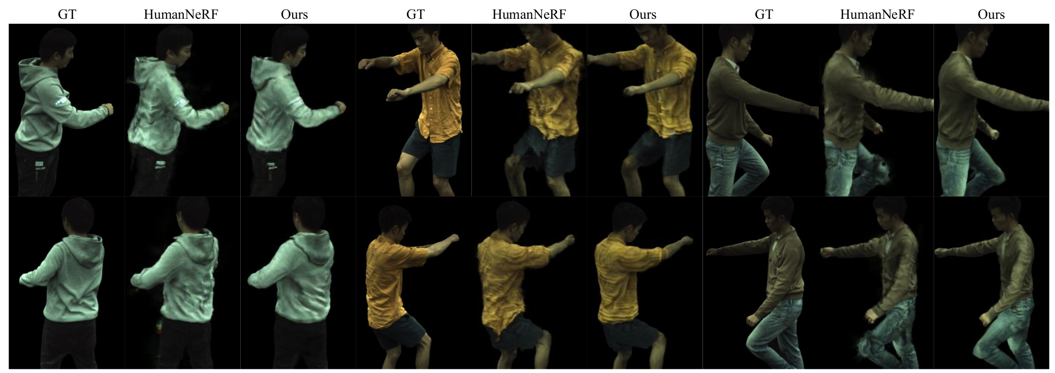 Figure 6: ZJU-MoCap 데이터셋에 대해 처음 보는 포즈들에 대한 novel actor들의 novel view synthesis를 위한 질적 비교. Ground-truth (GT), HumanNeRF, 그리고 우리의 결과는 왼쪽으로부터 오른쪽으로 보여진다. ActorsNeRF는 sharp boundary를 생성하며 더 나은 overall shape을 유지한다. 이는 category-level prior가 관측되지 않은 부분들을 smooth하게 합성하기 위해 이용될 수 있음을 가리킨다.