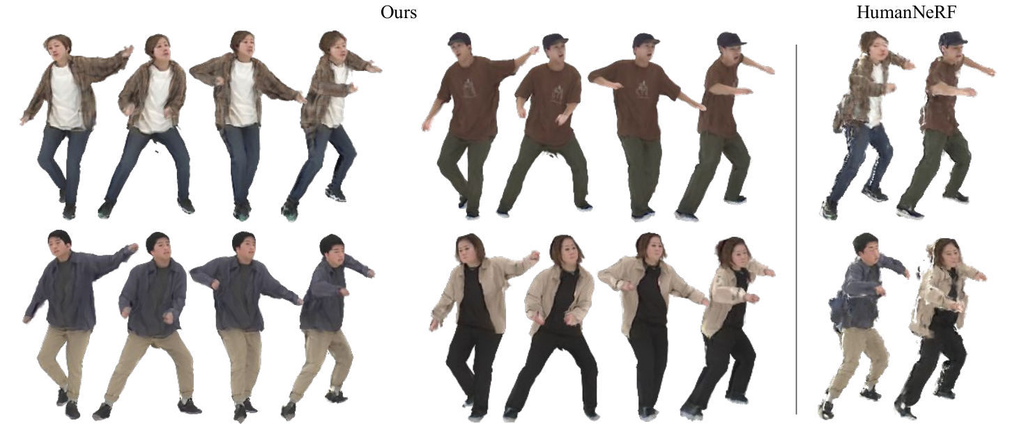 - 이와 비교해서, ActorsNeRF는 여전히 sharp boundary들을 생성하고 전반적인 모양을 유지한다.