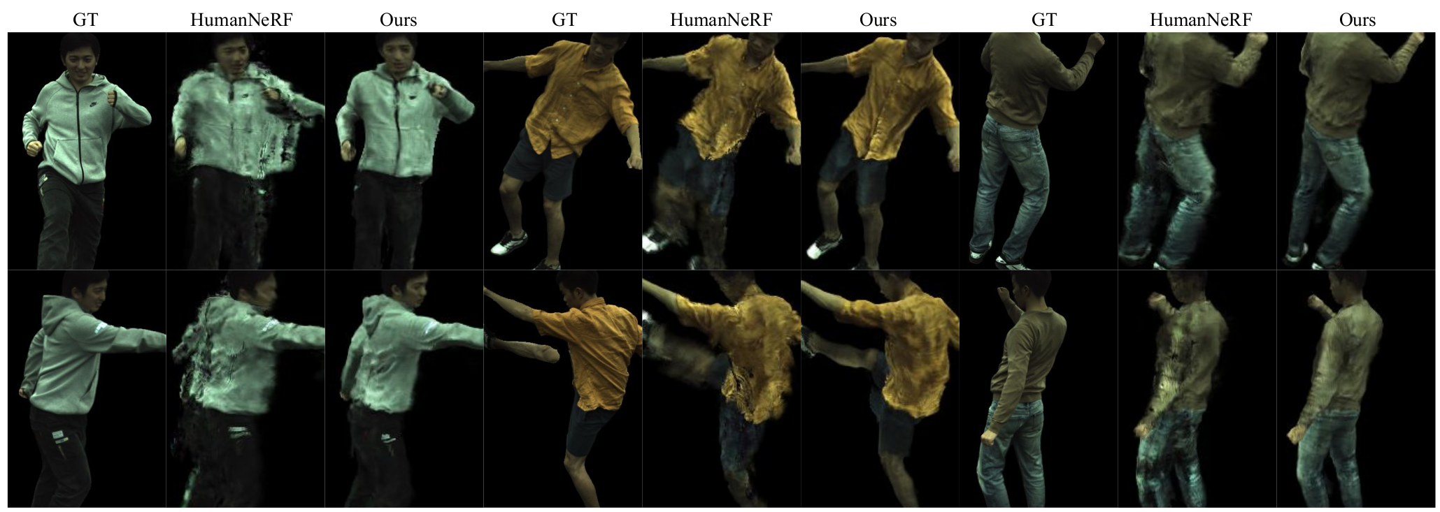 HumanNeRF는 rendered image들에서 왜곡된 boundary들과 함께 unsmooth, blurry textures를 생성한다.