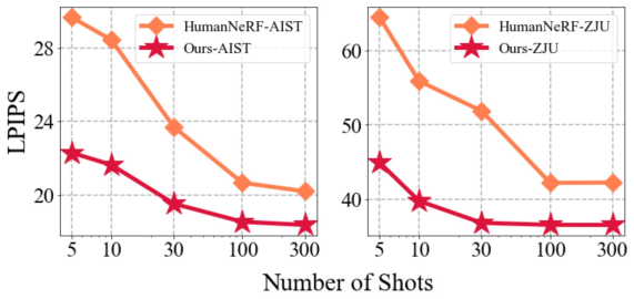 Table 1에서 볼 수 있듯이, ZJU-MoCap 데이터셋에 대해, ActorsNeRF는 모든 baseline 방법들을 모든 shot들에 대해 큰 차이로 압도하며 특히 LPIPS metric에서 더욱 그렇다.