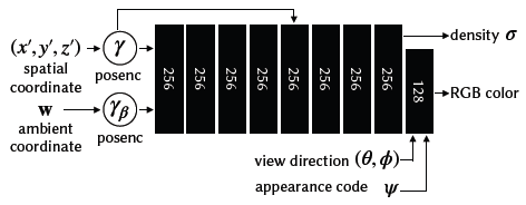 Fig. 13. A diagram of our hyper-space template network로 original NeRF MLP와 동일하지만 이것은 추가적인 ambient coordinate와 appearance latent code ψ를 입력받는다.