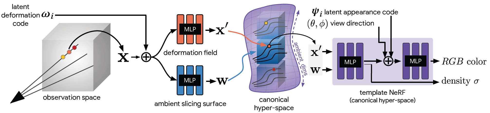 - 우리의 접근법은 hyperdimensional NeRF - a HyperNeRF를 통해 nonplanar slice로서 각 관측 frame을 모델링한다.