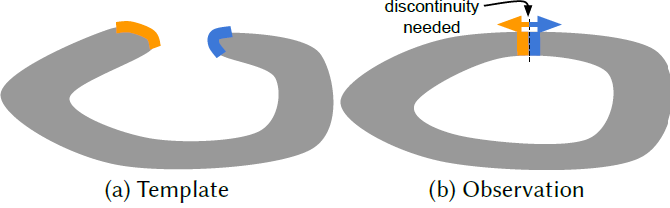 Fig. 4. ring이 marked seam에서 열리는topological change의 예시. Observation frame에서 template을 참고하는 deformation field는 접합부에서 불연속성을 요구하여 orange position에서 blue position으로의 극소량의 step은 deformation에서 큰 변화를 낳는다.