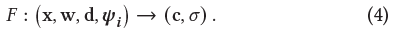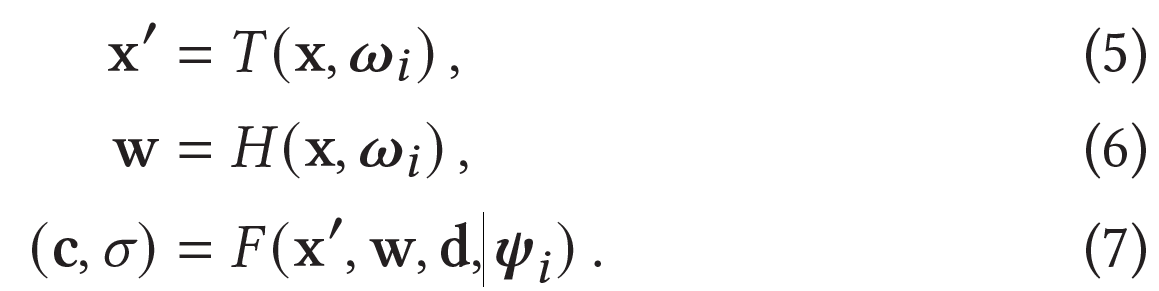 Template NeRF F, the spatial deformation field T, 그리고 the slicing surface field H가 주어졌을 때, the observation-space radiance field는 다음과 같이 평가된다.