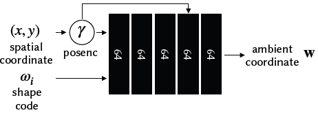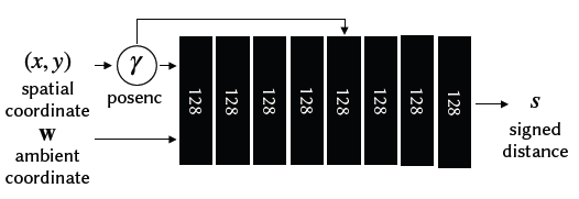입력: 2D 좌표 (x,y)∈[−1,1]2, an ambient coordinate w∈R, 그리고 출력인 a signed distance s.