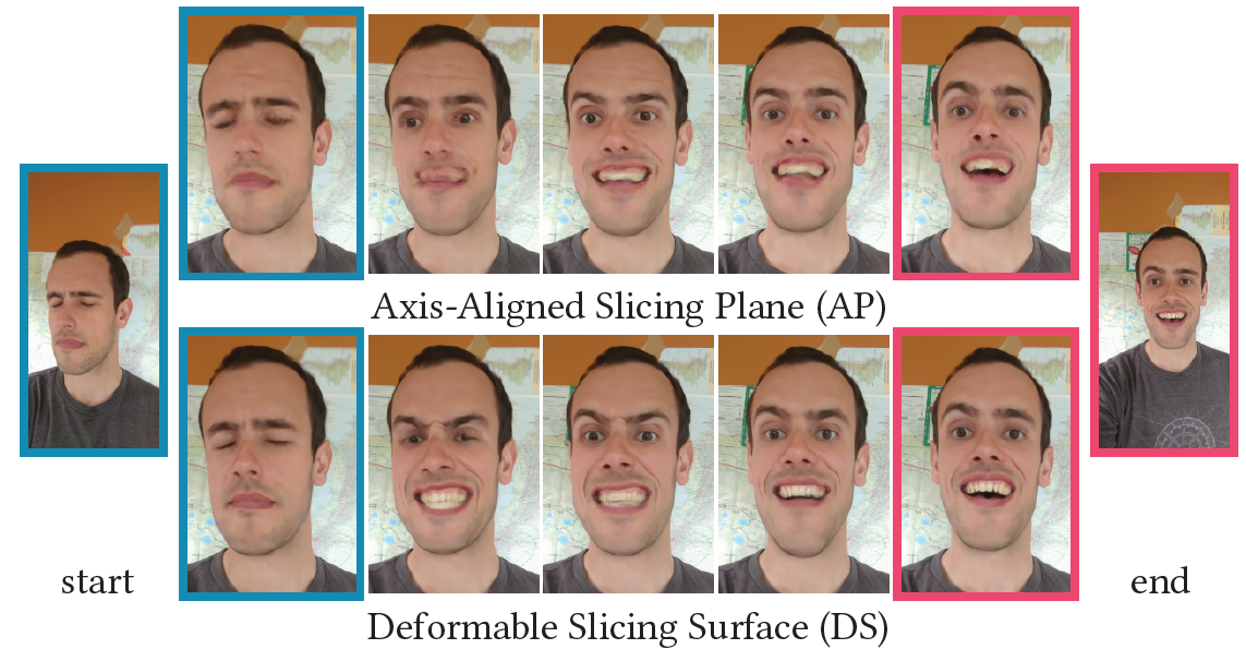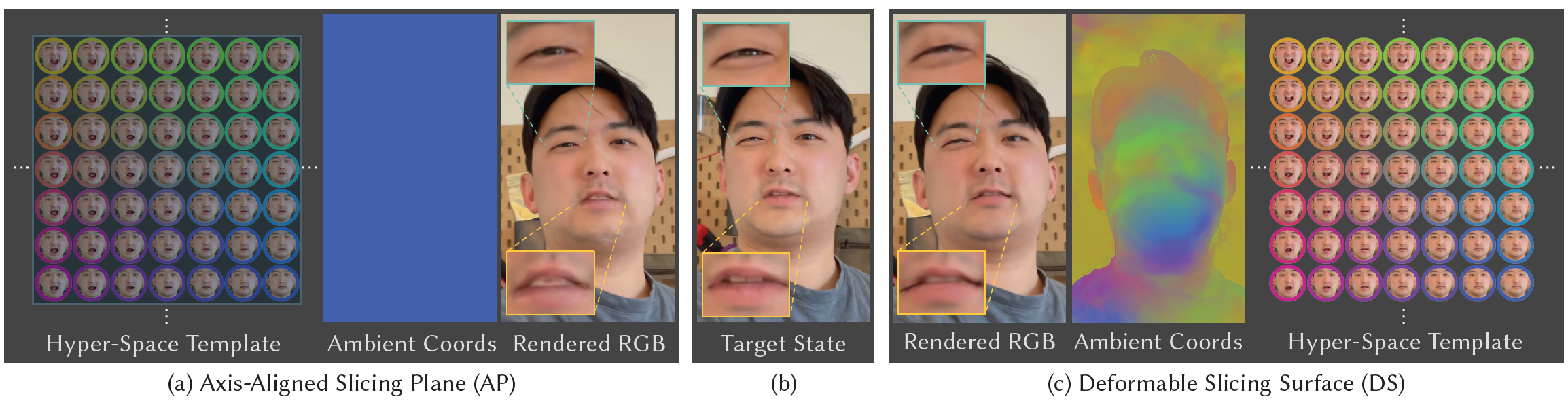 Fig. 6. 우리는 axis-aligned slicing planes (AP, a)와 deformable surfaces (DS, c)로부터 얻은 target state를 rendering한다.