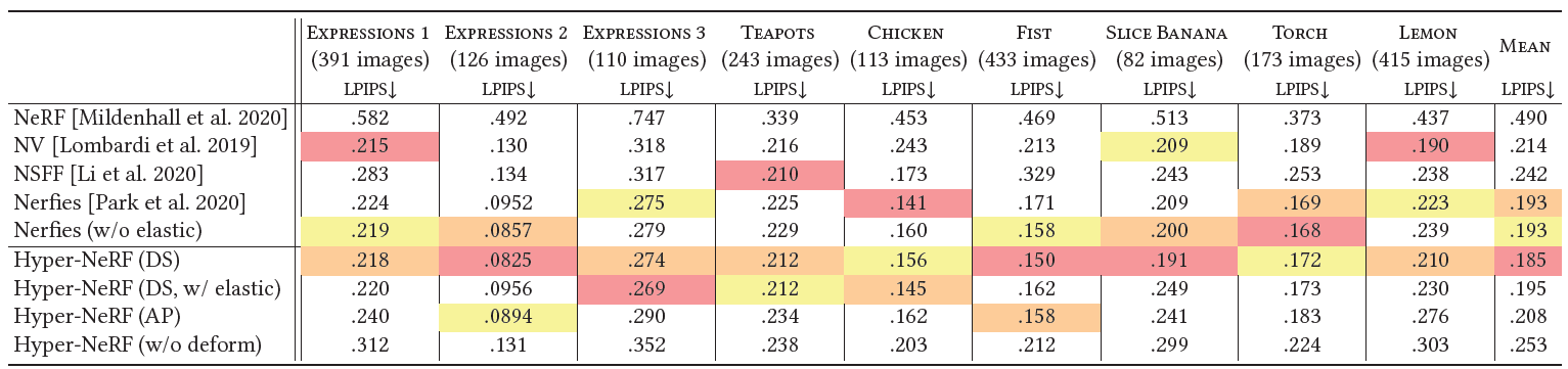 - Nerfies와 비교할 때, HyperNeRF는 interpolation을 통해 평균적 error를 4.1% 줄이고 측정된 LPIPS를 novel view synthesis에 대해 8.6% 줄인다.