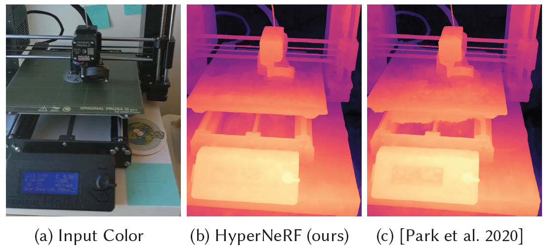 Fig. 9. Topology에서 기술적 변화가 없더라도, base에 대해 상대적으로 움직이는 3D printer의 bed는 deformation field에서 sharp한 변화를 요구하며 geometry에서 artifact를 만든다. HyperNeRF는 이를 완화한다.
