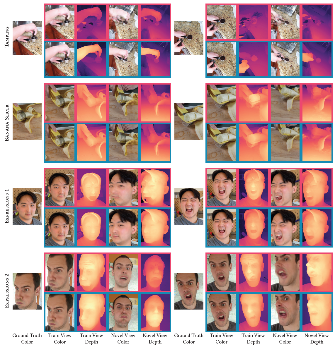 - 우리는 우리의 방법을 Nerfies, Neural Volumes, 그리고 NSFF와 비교했다.