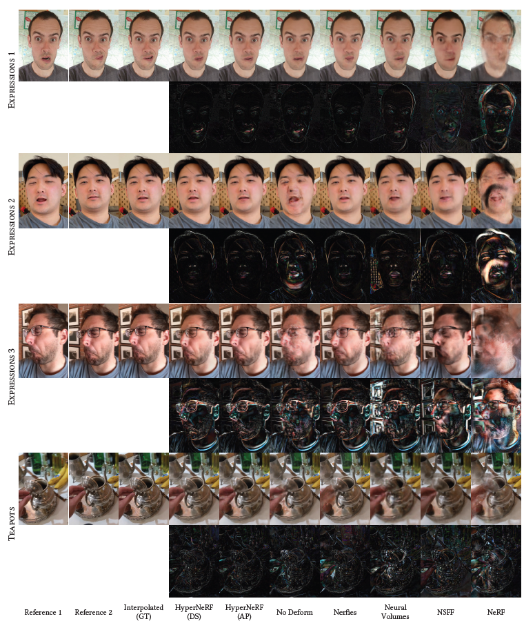 Fig. 12. interpolation dataset에 대한 우리의 방법, ablations, 그리고 baseline들에 대한 질적 비교. The interpolated frame은 두 latent frame들의 latent code 사이를 interpolate하는 것에 의해 rendering된다. 각 시퀀스들의 bottom row는 absolute error를 나타내며 baseline들은 Nerfies, Neural Volumes, NSFF, 그리고 NeRF이다.