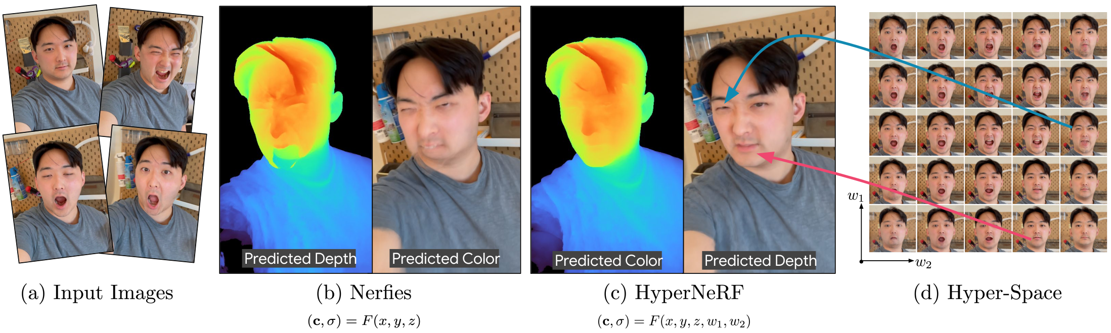 Fig. 1. Neural Radiance Fields는 deformation을 다룰 수 있는 능력이 주어졌을 때, 동적인 human subject들을 포착할 수 있고 현저한 deformation이나 topological variation이 있을 때 자주 어려움을 겪는다. (d)에서 보듯이 고차원의 공간에서 shape들이 family를 모델링할 때, HyprNeRF 모델은 topological variation을 다룰 수 있고 더 현실적인 rendering과 더 정확한 geometric reconstruction을 생성한다.