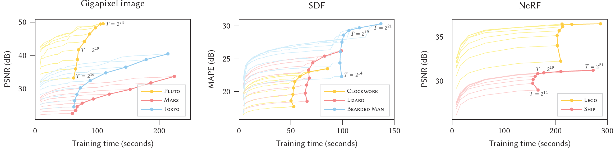 - 우리는 T의 영향을 Figure 4에서 분석했으며 우리는 3개의 neural graphics primitives에 대해 넓은 범위의 T 값들에 대해 test error vs training time을 보고했다.