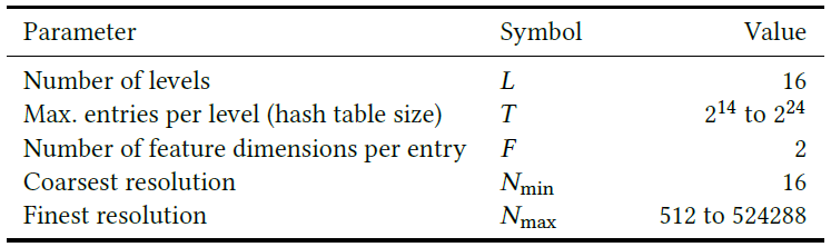 Table 1. 우리의 결과들에 대한 Hash encoding parameter들과 그 범위. Hash table size T와 max. resolution Nmax만 task에 tune되어야 함.