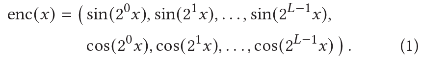 - NeRF에 사용된 positional encoding의 식은 위와 같다.
