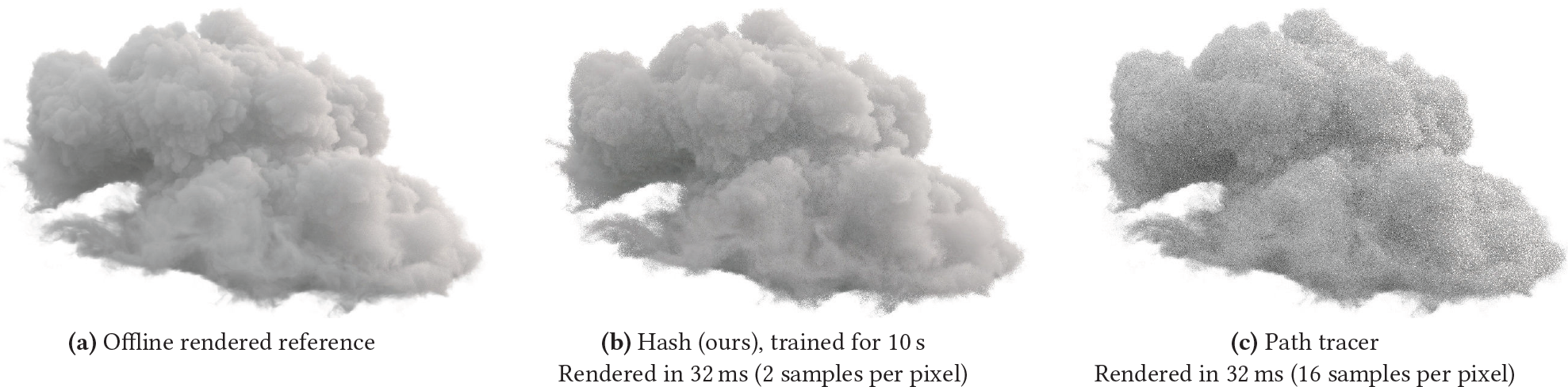 Fig. 13. NeRF cloud model 학습의 예비적인 결과. (b) 32ms안에, 우리의 모델의 1024 × 1024 이미지는 offline rendered ground truth에 확실히 근접한다. 우리의 모델은 같은 시간동안 학습한 GPU path tracer보다 더 적은 noise를 보여준다.