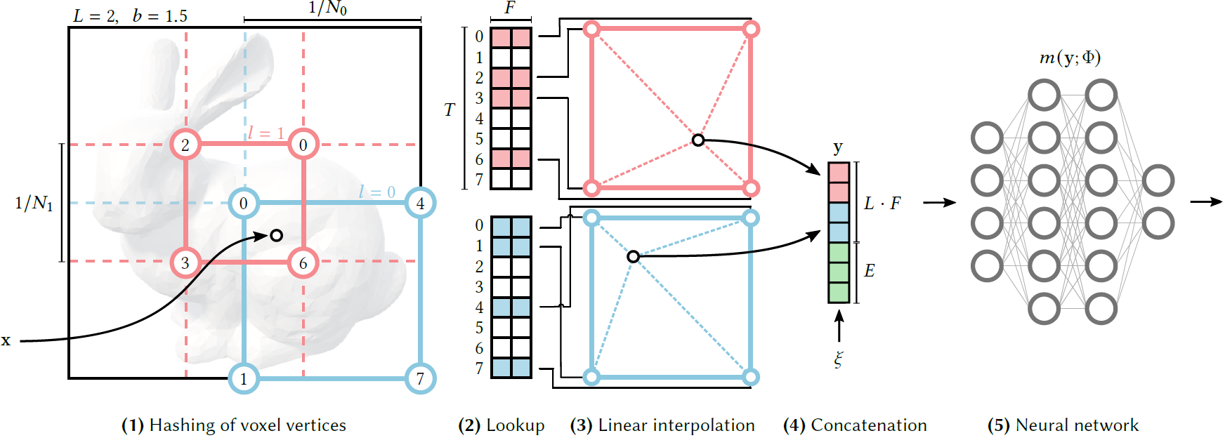 Fig. 3. Illustration of the multiresolution hash encoding in 2D. (1) 주어진 입력 좌표 x, 우리는 L resolution level에서 둘러싸는 voxel을 찾고 integer 좌표들을 hashing하는 것에 의해 그 coner들에 indices를 부여했다. (2) 모든 corner indices에 대해, 우리는 hash table θl로부터 대응하는 F-차원의 feature vector들을 look up했다. (3) l-th level에서 상대적 position x에 따라 그들을 interpolate한다. (4) 예비적인 inputs $ \xi \in \R^E$ 뿐만 아니라 각 level의 결과들을 이어붙여 encoded MLP input y∈RLF+E를 생성한다. Encoding을 학습하기 위해, loss gradients는 MLP, concatenation, the linear interpolation, accumulated look-up feature vectors를 통해 backpropagate된다.