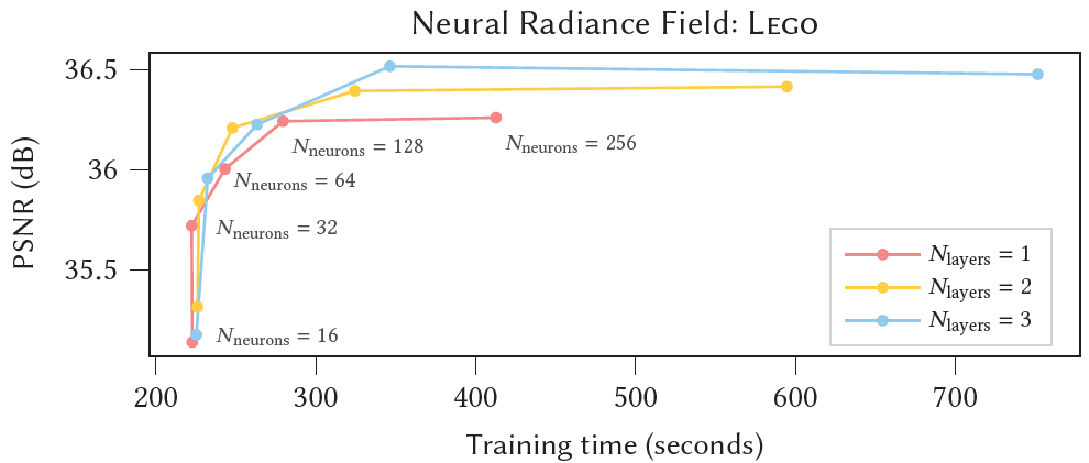 - LEGO scene에 대해 test error와 training time (31000 학습 steps)에 대한 MLP 크기의 효과. The curves는 density와 color MLP에서 뉴런의 수를 16부터 256까지 sweep했으며 우리는 Nlayers=2, Nneurons=64를 선택했다.