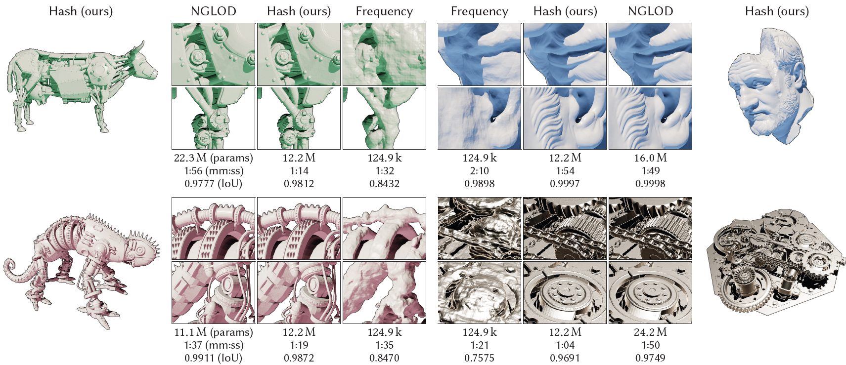 - NGLOD: Close-fitting octree의 cell 안의 SDF만 학습하여 가장 높은 visual quality를 달성헀다.