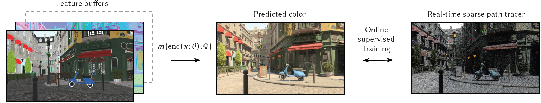 - The MLP m(enc(x;θ);ϕ)는 각 픽셀에 대해 독립적으로 feature buffer들로부터 photorealistic pixel color들을 예측한다.
