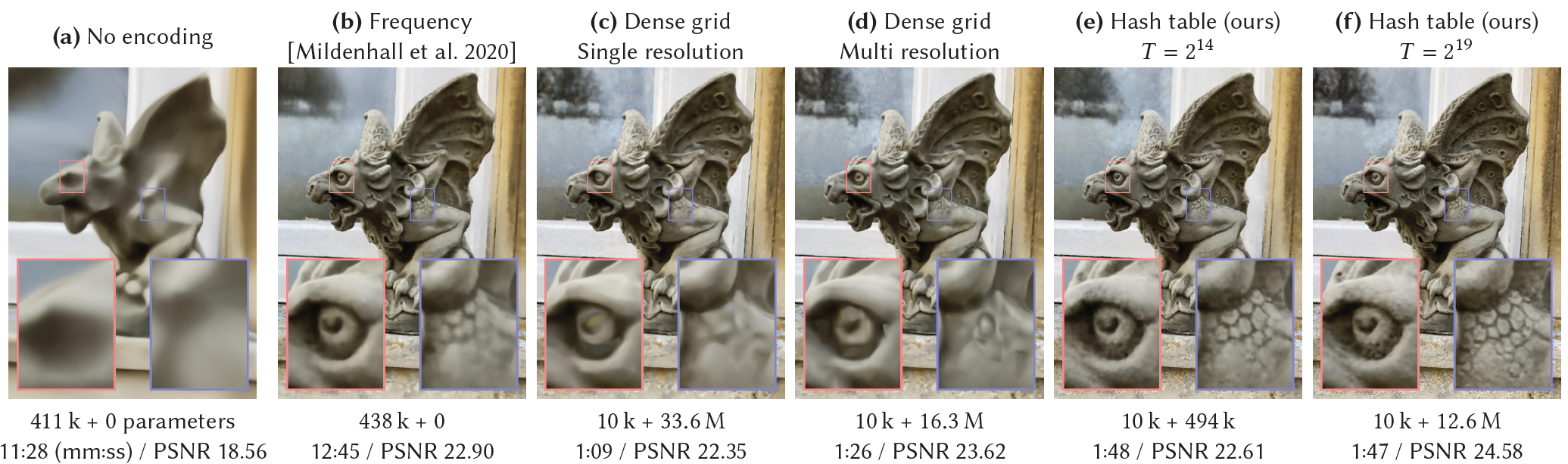 Fig. 2: 학습 가능한 feature embedding들에 대해 다른 encoding과 parametric data 구조들의 reconstruction quality의 증명