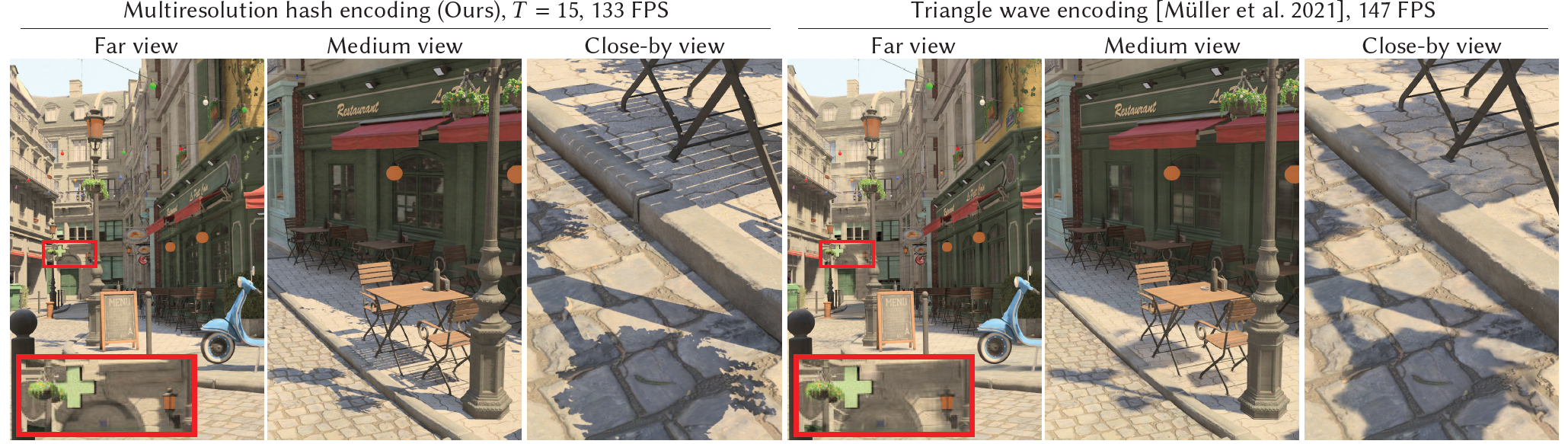 Fig. 9. Neural radiance caching은 약한 성능 penalty만 갖고 multiresolution hash encoding으로부터 훨씬 향상된 quality를 얻는다.