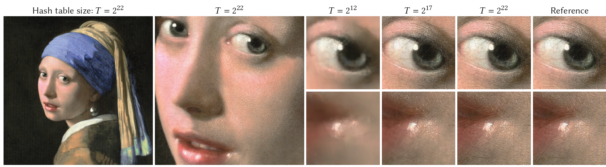 Fig. 6. 우리의 multiresolution hash encoding과 함께 200000×23466 해상도의 RGB image 근사를 나타낸다. Hash table size T 값이 212, 217, 222로 증가함에 따라 모델의 학습 가능한 parameter의 수도 117k, 2.7M, 47.5M으로 증가함.