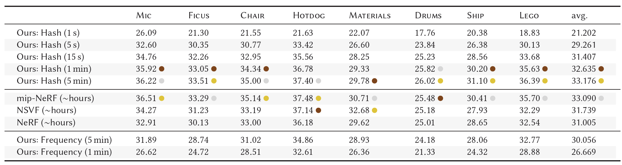 - Table 2. 우리의 multiresolution hash encoding을 가진 NeRF의 시행과 NeRF, mip-NeRF, NSVF의 PSNR 비교.