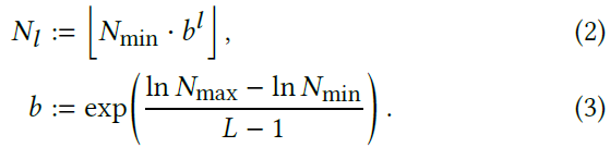 - 각 level은 독립적이고 개념적으로 feature vector들을 grid의 vertice에 저장한다. 각 resolution은 coarsest와 finest resolutions 사이의 geometric progression에 따라 선택된다. [Nmin,Nmax]