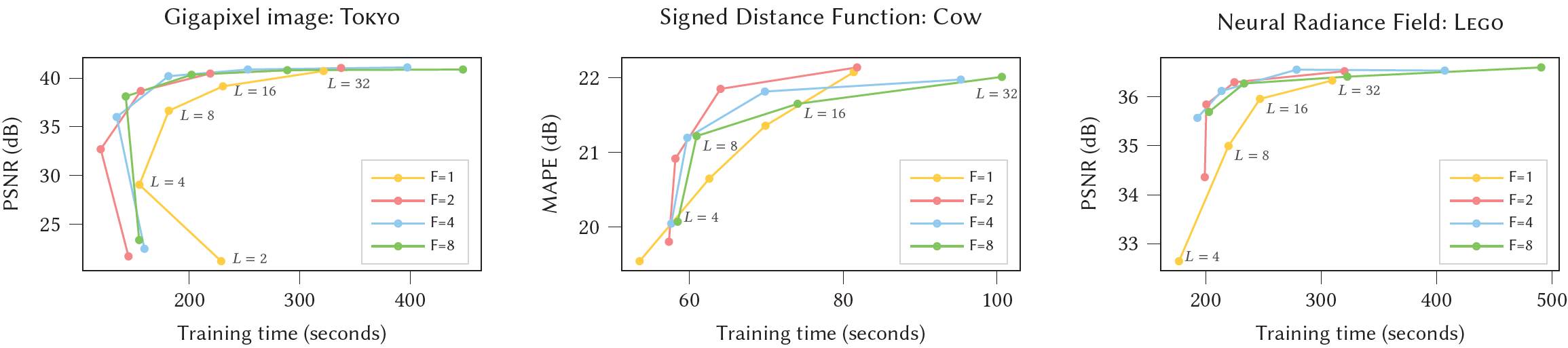 (F=2,L=16)이 모든 application에서 best-case performance and quality에 가까우므로 우리는 모든 결과들에 대해 이 configuration을 사용한다. F=1은 RTX 3090 GPU에 대해 느린데 이는 atomic half-precision accumulation이 2D vectors에 대해서만 효율적이지만 scalars에 대해서는 아니기 때문이다. NeRF와 Gigapixel image에 대해 학습은 31000 steps에 끝났고 SDF는 11000 steps에 끝났다.
