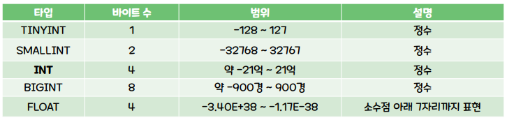 - DATETIME : 8바이트 : 날짜와 시간 저장 ( YYYY-MM-DD HH : MM : SS 형식 )